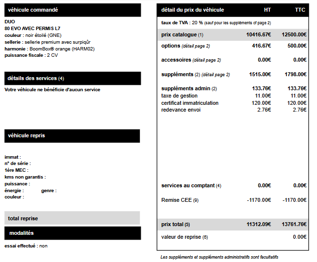 Le montant de la prime dépend du quadricyle choisi avec permis DUO 80 EVO - L7 ou sans permis DUO 45 NEO - L6 et de la qualité de l’acheteur particulier ou flotte publique ou autre personne morale , conformément à l’Arrêté du 30 décembre 2024 de la fiche TRA-EQ-130 du dispositif CEE.