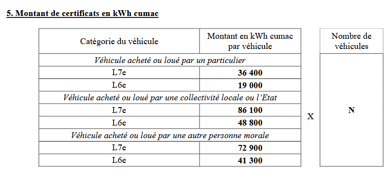 Le fait d’avoir une fiche d’opération standardisée peut donner l’occasion au politique de proposer un « coup de pouce ». C’est une bonification temporaire pour encourager certaines opérations, ça se fait par arrêté ministériel sur la base de la fiche existante. On garde les critères d’exigence de la fiche pour le choix du véhicule, on y met une condition supplémentaire comme par exemple « remplacement de tel véhicule très polluant, critères à définir », et là le calcul des kWhcumac de la fiche est remplacé par un montant forfaitaire fixe et plus élevé, il peut même être encore bonifié selon la catégorie fiscale des bénéficiaires.