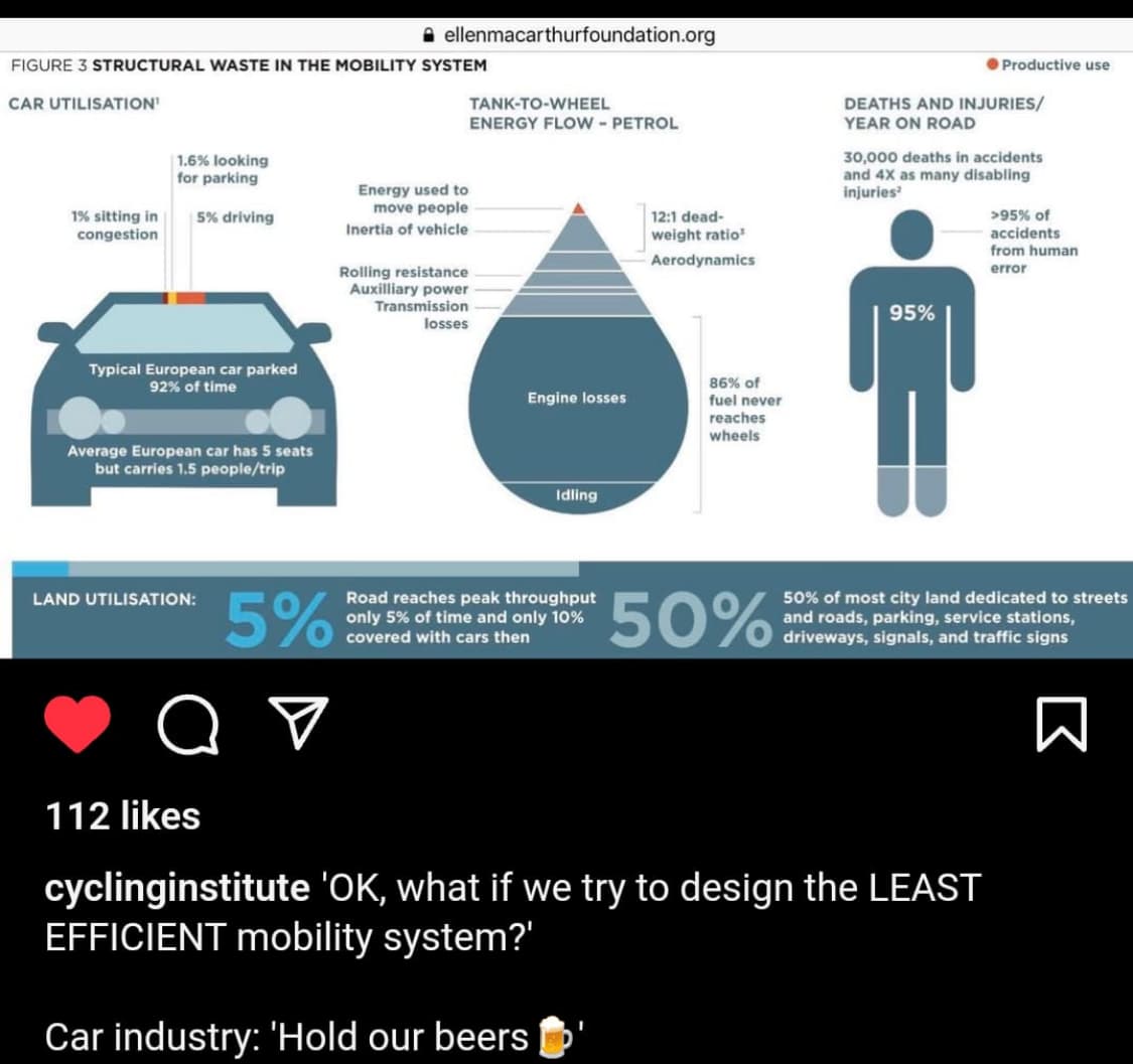 Si quelqu’un inventait un produit qui tue autant de personnes que les deux guerres mondiales réunies, en mutile au moins 50 millions d’autres chaque année et engloutit jusqu’à 70 % des revenus de toute une vie, en voudriez-vous un ? Le voudriez-vous jamais ?C’est ce que l’on estime que la voiture nous a coûté depuis que la première a pris la route il y a plus d’un siècle, écrivent l’anthropologue sociale Henrietta Moore et l’urbaniste Arthur Kay dans Roadkill : Unveiling the True Cost of Our Toxic Relationship with Cars ( → https://getroadkill.com/ ). Pourtant, notre soif de voitures reste sans limite. Nous en avons une pour cinq personnes aujourd’hui, la plupart du temps dans des villes qui ont été conçues autour d’elles et qui, selon ce livre, pourraient être des lieux de vie plus sûrs, plus calmes et plus agréables.